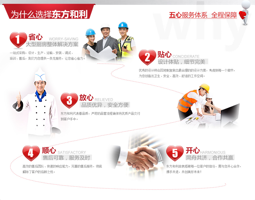廚房工程建設是一項龐大復雜的系統工程,既需要與后勤工作人員、廚師溝通協調, 又要與土建、裝修、機電、暖通等工程人員相互配合,工作量十分巨大。同時還要采購眾多的食品機械、工具,這對沒有相關經驗的我們來說確實是一個挑戰。有時候我們面對廚師提出的長長的采購需求清單就已經眼花繚亂了。 幸好東方和利提供的是整體解決方案,從前期的設計咨詢到后期的安裝調試、從大型設備到餐具小件,包括各種食品機械,排煙通風,這些瑣碎事情都由東方和利來完成,為我們提供量身定制的解決方案。一站式采購為我們節省了大量精力,而且所有廚具都由東方和利來保修,對我們來說也更加方便??傊?,東方和利的服務讓我們非常省心,我很滿意。